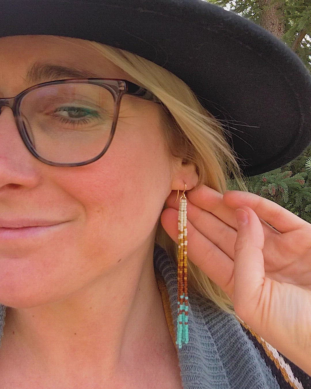 Inspired by a warm summer sunset over the cool blue water of the Pacific. A beautiful 4 color variation of our beloved long fringe beaded earrings.